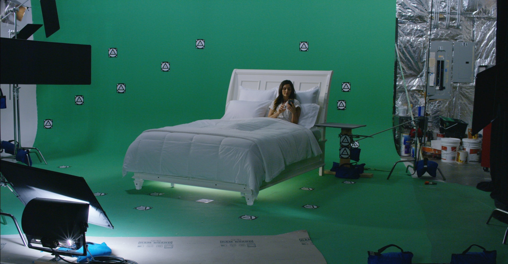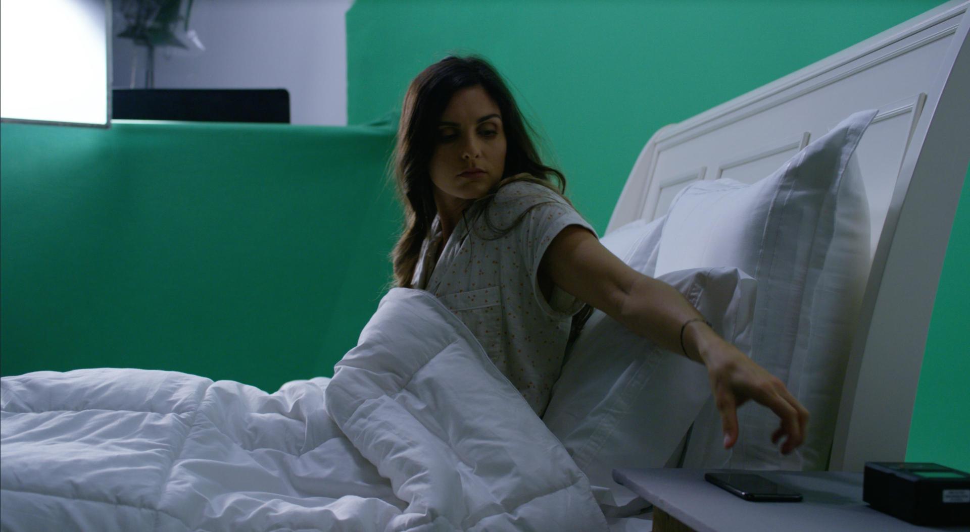 We decided on an almost entirely green screen approach, constructing the bed on a sound stage, with the practical elements being limited to the actress, the bed and the phone – we even constructed a ‘green and grey’ night stand for the phone pick up. We chose a dolly jib, over a gimbal rig, to create a higher angle, steady swooping shot, optimizing our track markers and flexibility in post.